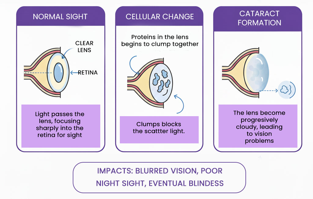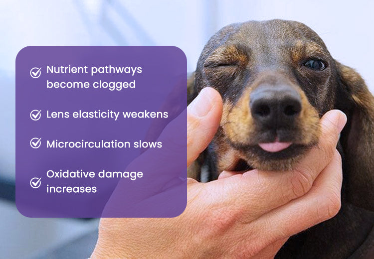 Vision problems in pets often stem from microscopic waste buildup inside the eyes. As these blockages accumulate: